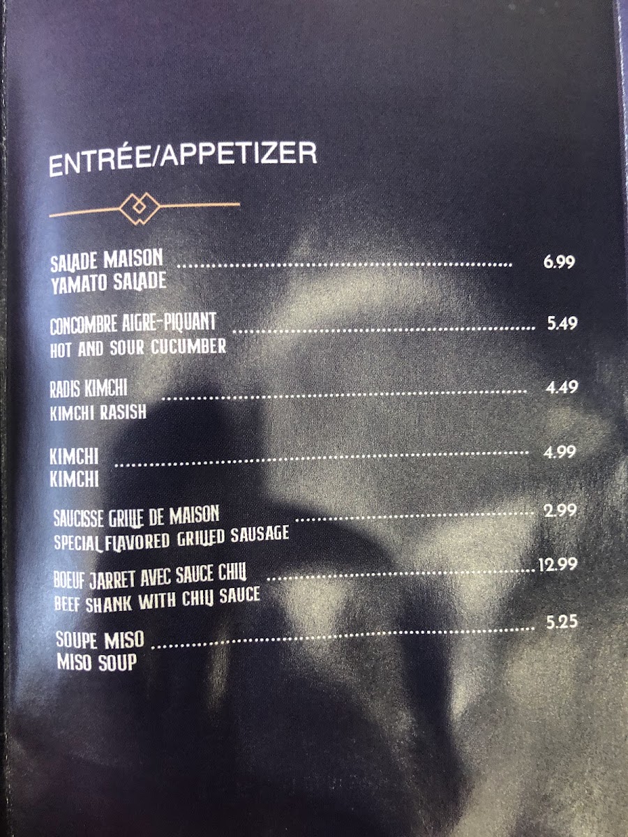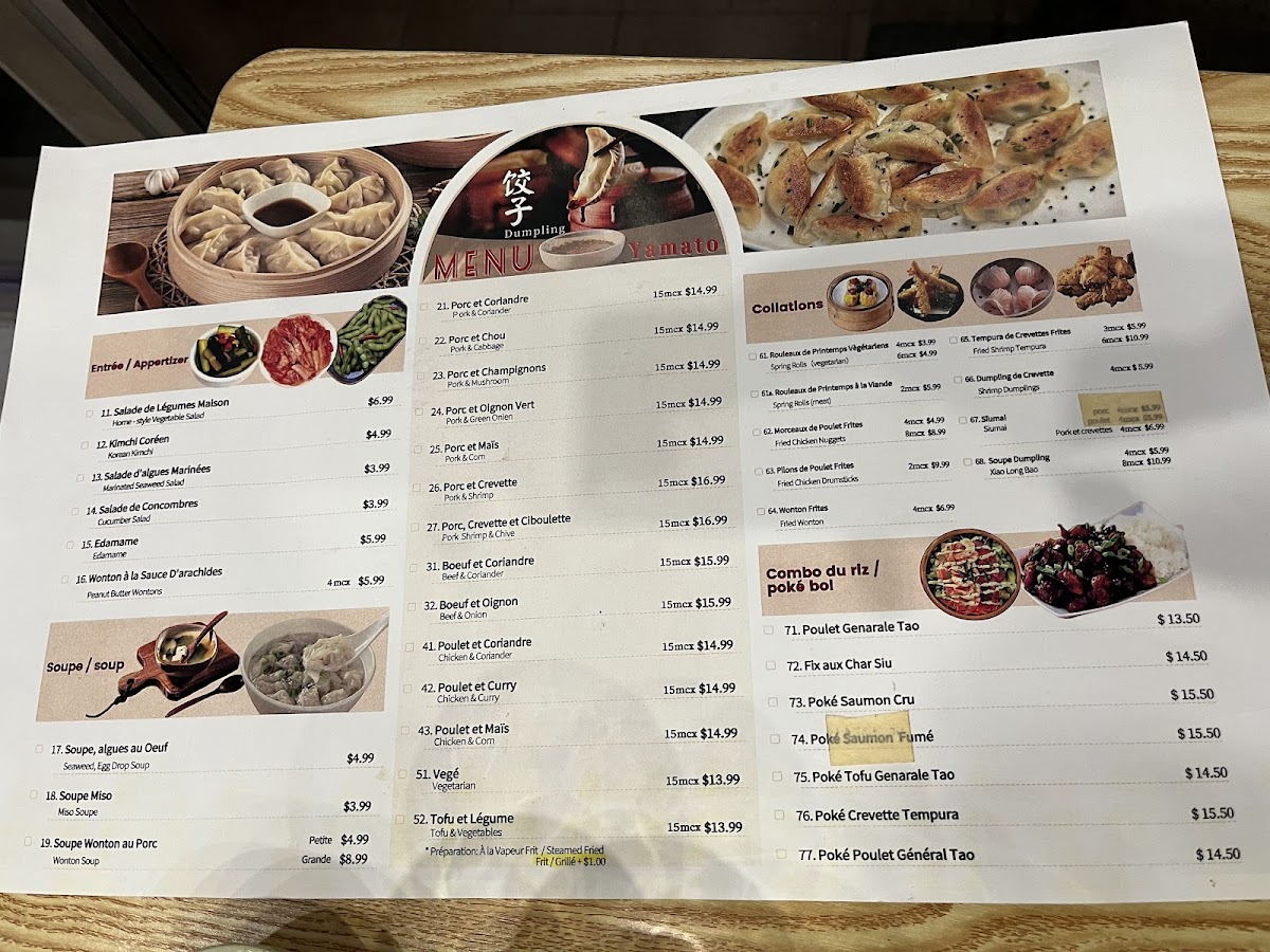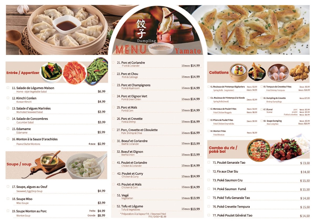 The menu at Yamato Dumpling focuses primarily on a variety of dumplings, offering several options including beef, pork, lamb, tofu, rice noodle, and vegetable dumplings. These dumplings are available in different preparations such as steamed or fried, providing a range of flavors and textures. Alongside dumplings, the menu features complementary dishes like wonton soup, sweet and sour cucumber salad, edamame, karaage (Japanese fried chicken), and Korean-style kimchi, contributing to a diverse selection of light meals and appetizers.